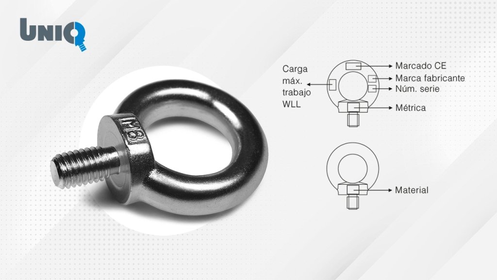 Algunas anillas de elevación indican el grado del acero empleado en su fabricación (por ejemplo, grado 8 o grado 10). Sin embargo, el parámetro más relevante para la selección del producto es la WLL (Working Load Limit) o CMU (Carga Máxima de Utilización), que refleja la capacidad de carga certificada por el fabricante.