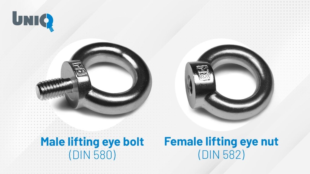 Discover the differences between DIN 580 lifting eye bolts (male) and DIN 582 lifting eye nuts (female), how to choose the right lifting point, and UNIQ certified solutions from Damesa.