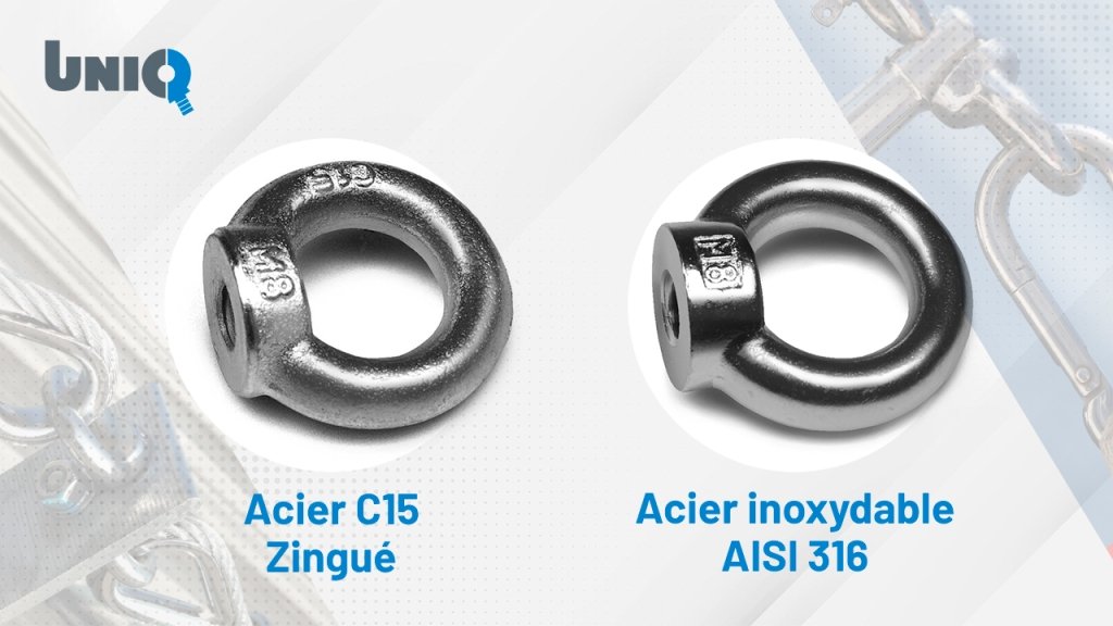 Dans les applications marines, chimiques ou agroalimentaires, où l’exposition à l’humidité ou à des agents corrosifs est élevée, il est conseillé d’utiliser des anneaux de levage en acier inoxydable. Ce matériau offre une meilleure résistance à l’oxydation, une grande longévité et nécessite peu d’entretien, même en conditions sévères.